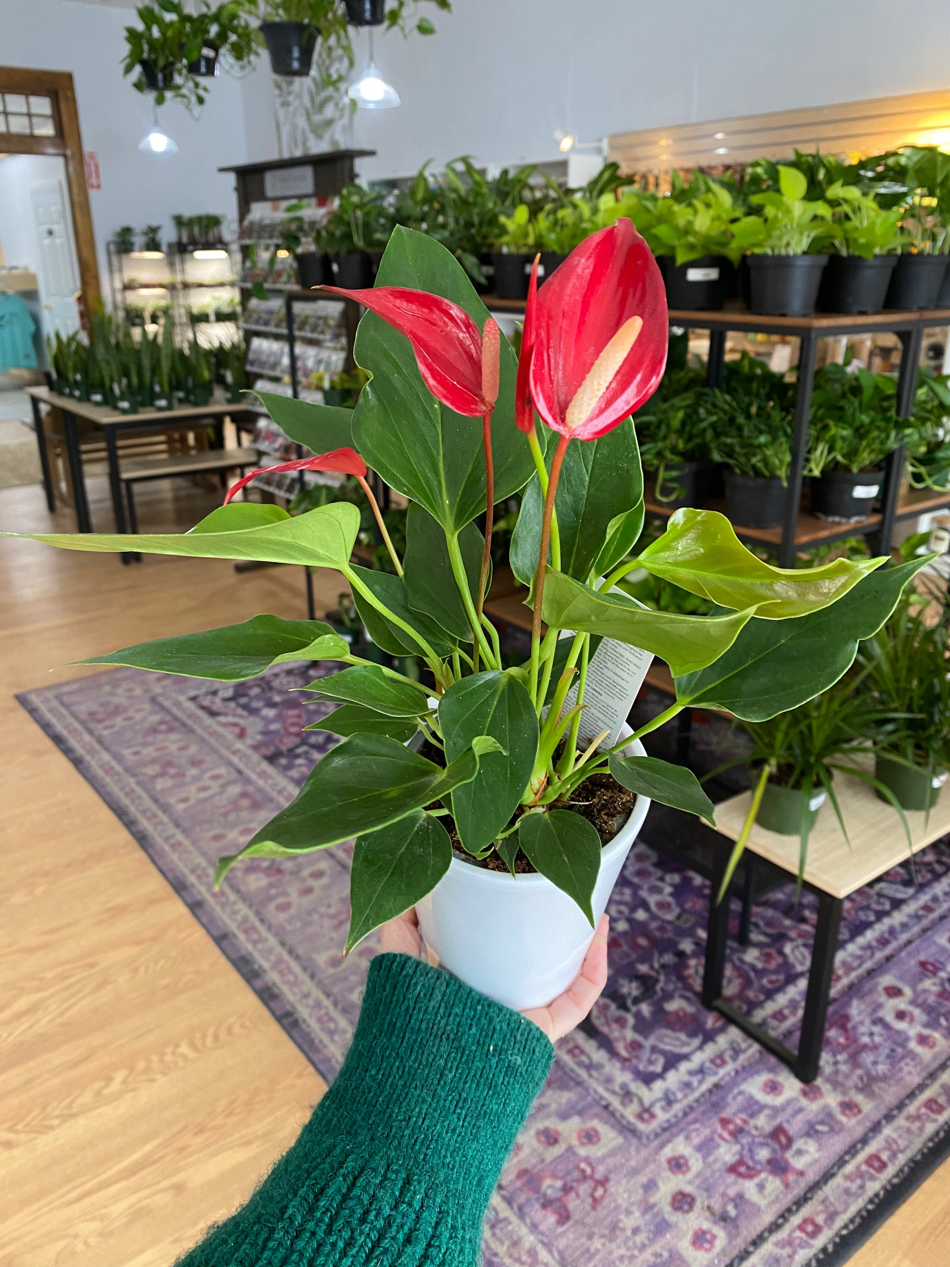 Anthurium andraeanum is known for its glossy, heart-shaped leaves and long-lasting, waxy blooms that add a bold pop of color indoors. What appears to be the “flower” is actually a colorful spathe, paired with an upright spadix that can last for months with proper care. This plant is a favorite for bright interiors and brings a clean, modern look to any space.