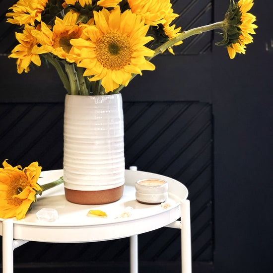 The large handmade cylinder vase is just the right size for two dozen or more roses. We were able to fit 18 sunflowers with their thick stems for a bright summer arrangement.