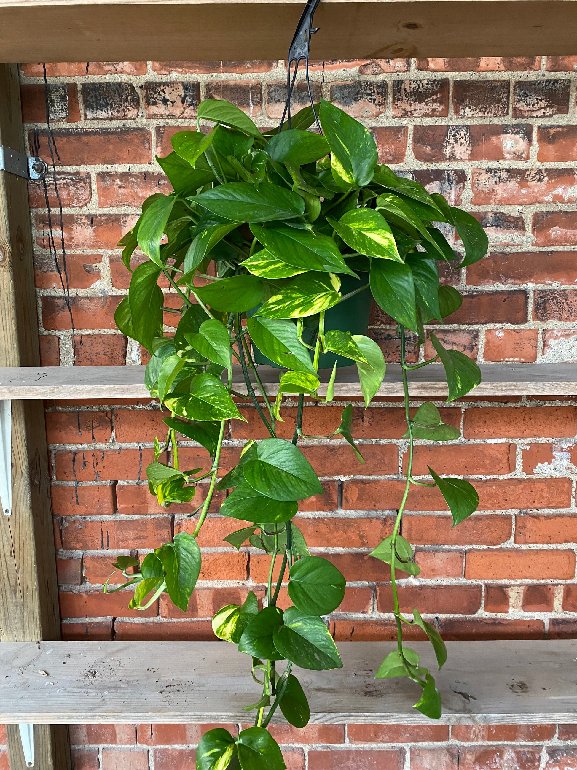 Epipremnum aureum ‘Golden Pothos’ features heart-shaped leaves with bright green centers streaked and splashed with golden yellow variegation. Its vigorous trailing and climbing stems create a textured, cascading display, perfect for shelves, hanging baskets, or training along supports.