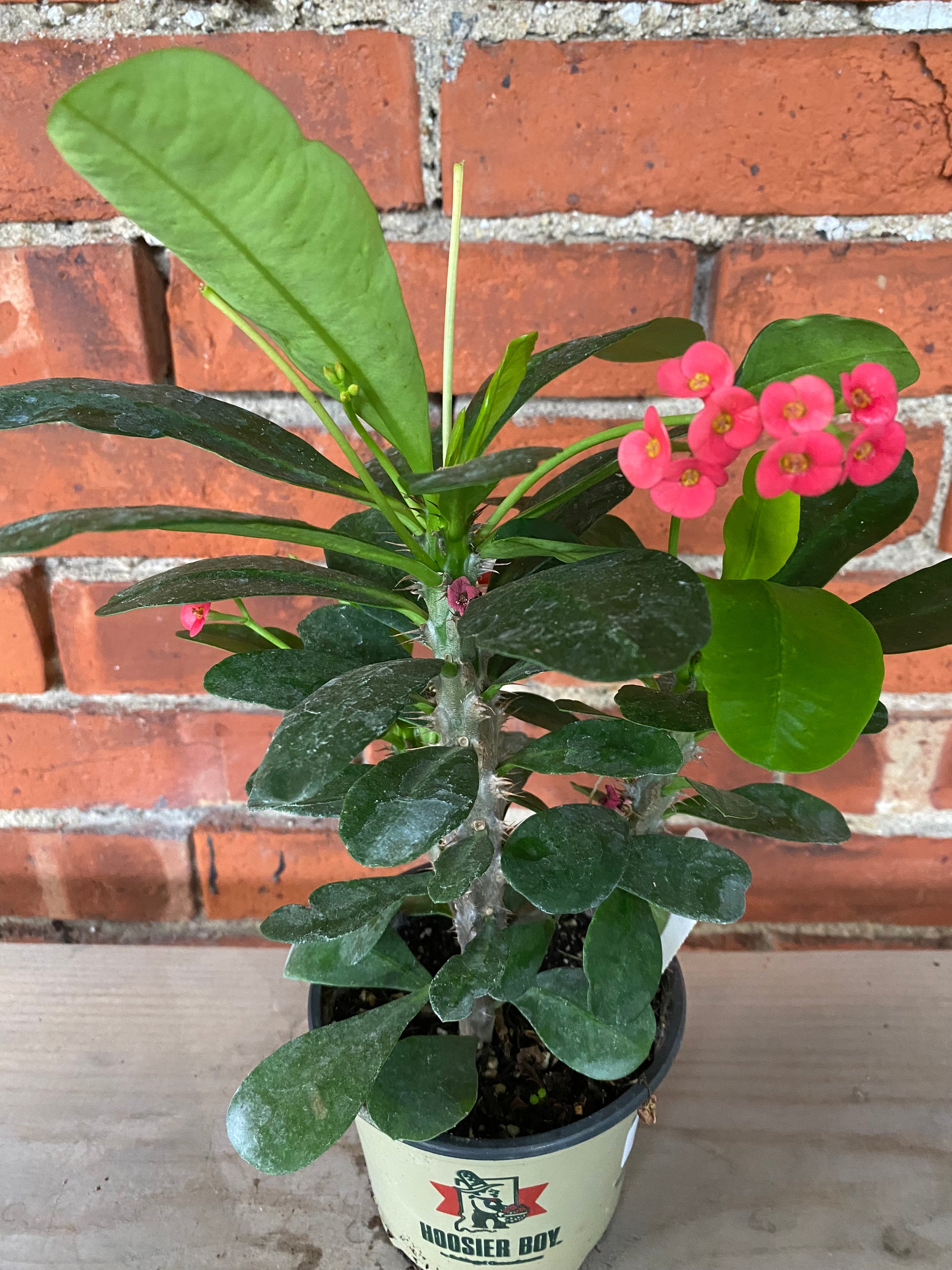 Euphorbia milii, commonly called ‘Crown of Thorns,’ features thick, green stems covered in small, sharp thorns, topped with clusters of bright, showy flowers that can range from red to pink or yellow. Its compact, branching growth habit creates a textured, sculptural display perfect for tabletops or sunny corners.