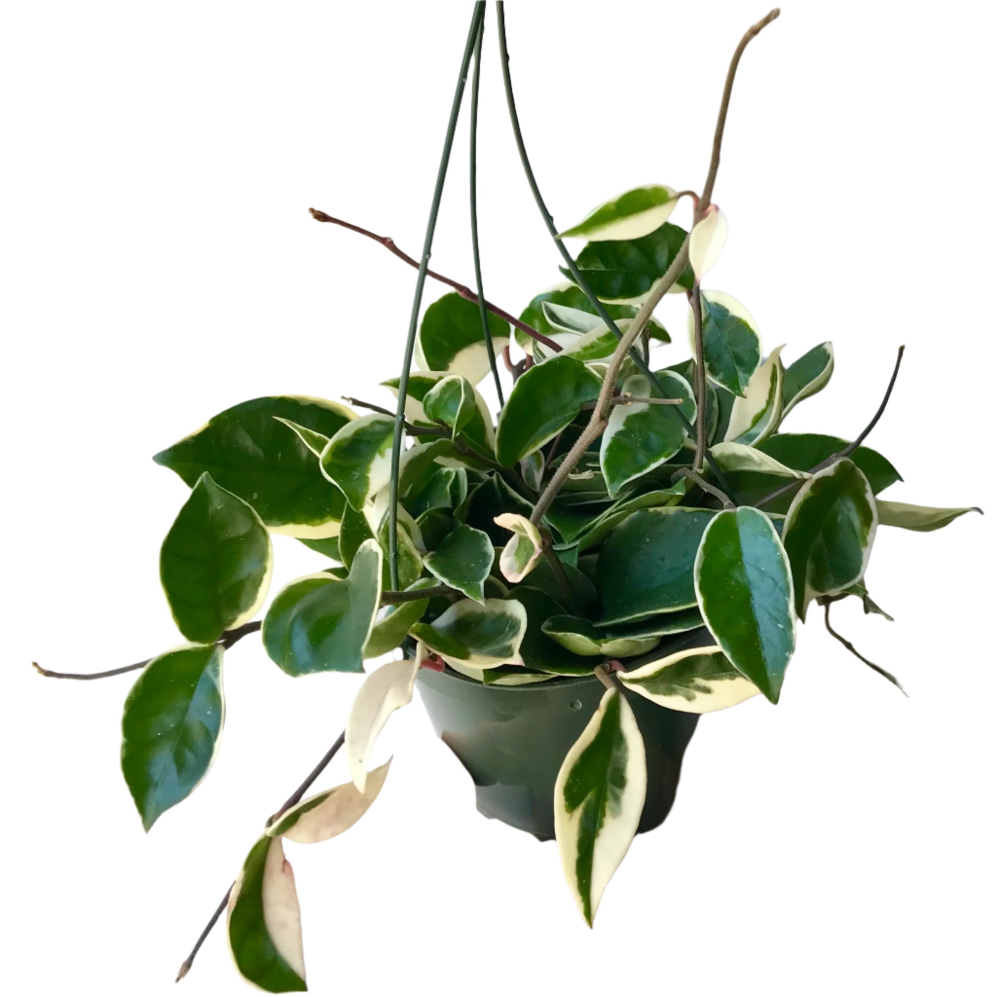 Hoya carnosa ‘Krimson Queen’ is a classic vining houseplant prized for its thick, waxy leaves edged with creamy white and soft pink tones, especially on new growth. With time, it produces trailing vines that are perfect for shelves or hanging planters, and mature plants may reward you with clusters of fragrant, star-shaped flowers.