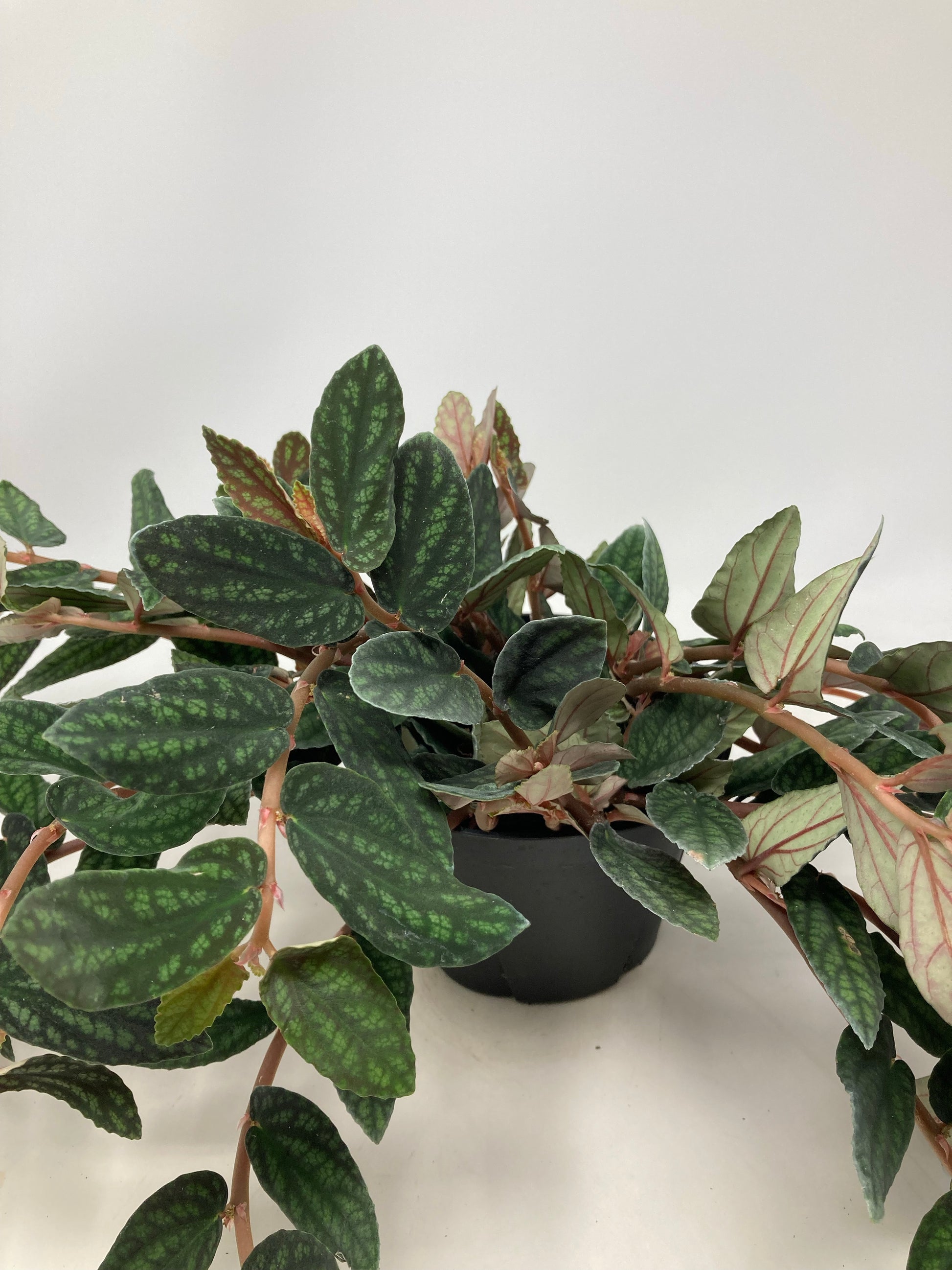 Sometimes referred to as a begonia, however this is misleading as the plant is not a begonia nor in that family at all. They have dark, lance-shaped leaves with creamy mint green centers. It’s able to form a thick interwoven foliage mat, climb terrarium backgrounds and hardscape, or delicately trail from a hanging basket.