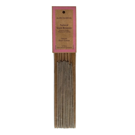 Auroshikha Natural Resin ~ Siam Benzoin Incense Sticks. Natural Resin Siam Benzoin Incense burns at least for 1 hour. 100% natural and pure ingredients. Made from high quality organic Siam Benzoin resin, this subtle and calming scent has a sweet balsamic fragrance similar to vanilla. Ideal for mediation and relaxing with its warm woodsy undernotes. Thicker and longer than the usual thinner varieties, emitting a very light, pure and inspiring fragrance. All Incense is traditionally prepared, hand rolled, never mass produced. Each package contains 10 incense sticks.