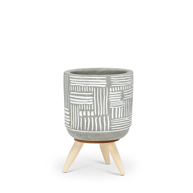 Add some tribal flair to your favourite plant or flowers with this distinctive Small Grid Tripod Planter. Crafted out of cement and wood, this grey and white planter's modern spin on tribal patterns makes a subtle yet stylish complement to any type of decor.