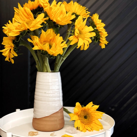 The large handmade teardrop vase is just the right size for a dozen or more roses. We were able to just fit a dozen sunflowers with their thick stems for a bright summer arrangement.